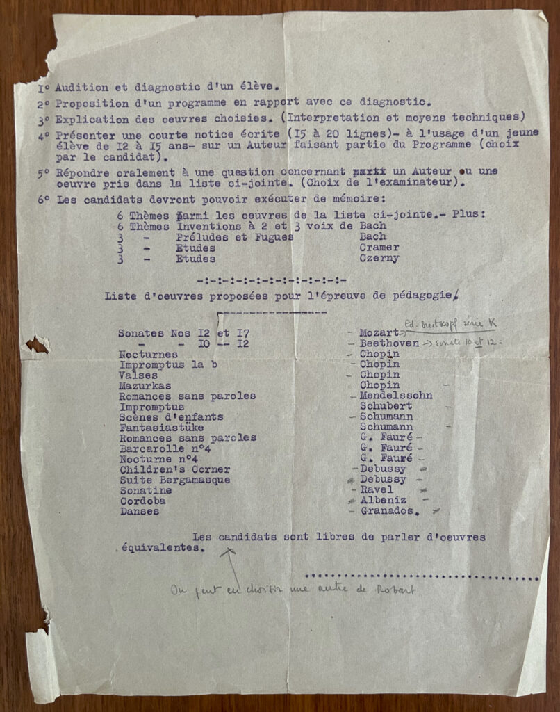 Also, I found a mimeographed page of requirements for the License d’Enseignement” (teaching license) and a list of familiar pieces that a piano pedagogy candidate should be familiar with. A very complete resumé for a young person! Mom passed this degree in 1938 and, at the age of 18, was well-trained for her future career as a well-rounded music teacher.
