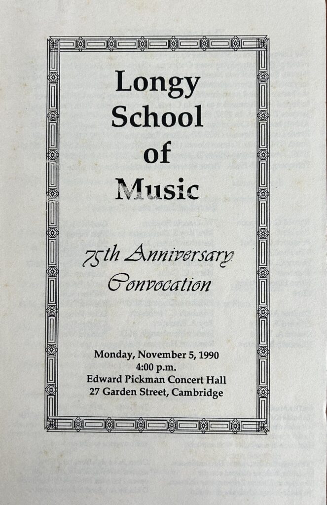 With the approaching commemoration of Longy’s 75th anniversary, my thoughts go back to the beginning of my long association with the school. It is a different place now- larger, much busier, and certainly much better known by the musical public of the Boston area. But some things have not changed. Despite the additions to the building, the character of the fine mansion remains the same as I remember it, the warmth and friendliness of someone’s home rather than that of an institution. And I like to think that the character of faculty, students, and administrators continues to be that of a large community with similar interests: the enjoyment of music and the pursuit of excellence in performance.
